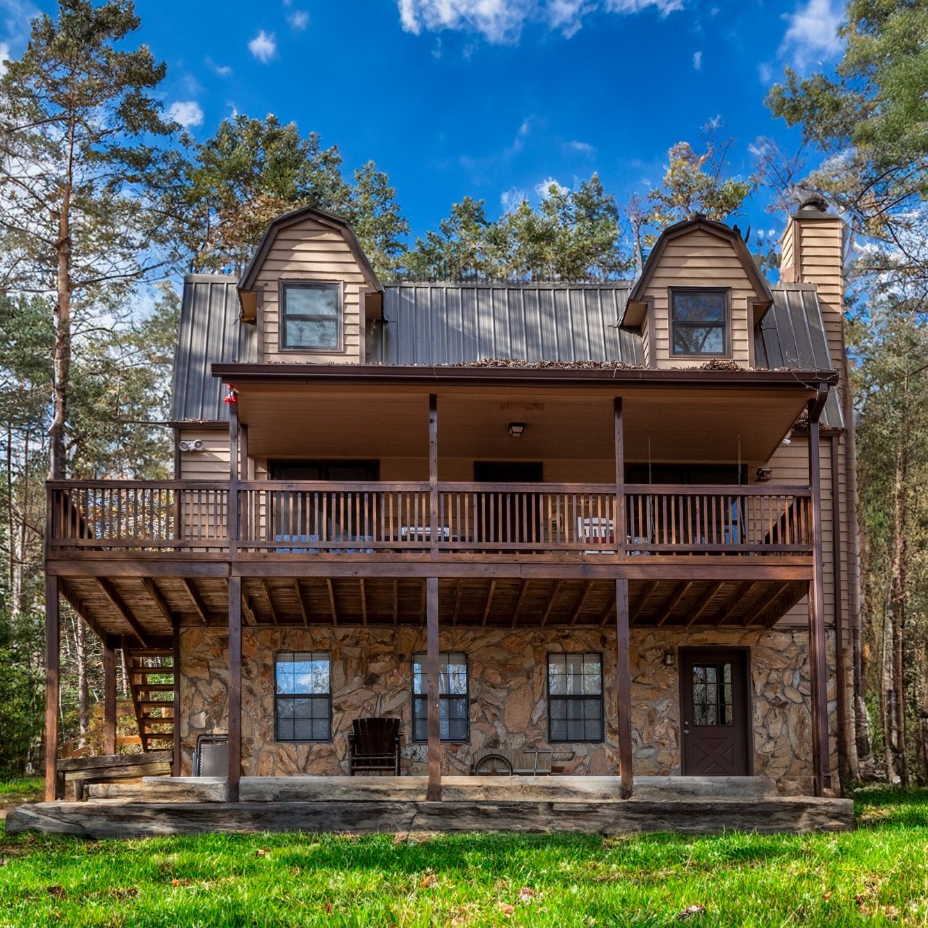 This spacious 4-bedroom, 3-bath retreat has everything you need to create lasting memories in the mountains. It includes a creek-fed pond for fishing, a shady porch swing for sipping your morning coffee, and a variety of amenities like a basement playroom with ping pong, TV, DVD player, and a stone-clad wood-burning fireplace. With three levels of space, this cabin comfortably accommodates larger families and sleeps approximately 10 people.